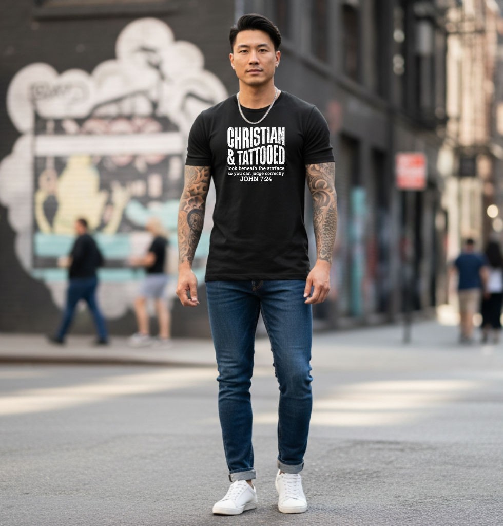 Break the mold and share your testimony with the Christian & Tattooed John 7:24 T-Shirt. This bold tee features a minimalist cross and “John 7:24” on the front left chest, while the back delivers a powerful message: “CHRISTIAN & TATTOOED — look beneath the surface so you can judge correctly. JOHN 7:24”