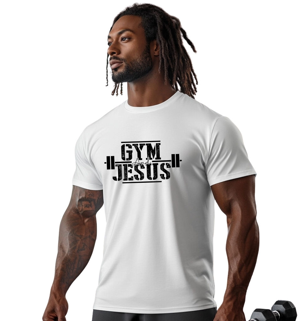 - Bold "Gym and Jesus" design with distressed typography and barbell graphic